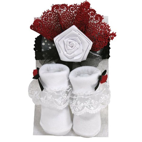 Got a little diva on your hands? Bringing up an absolute princess? Our “Angels In Lace” collection help celebrate your little one’s individuality. The nylon crocheted headband is adorned with lace, tulle and a satin rosette, and the lace-trimmed socks nicely compliment the headband. Coordinates perfectly with our Angels in Lace outfits — or adds a touch of dress-up to any outfit! Comes boxed in clear PVC. Fits 6-12 months.