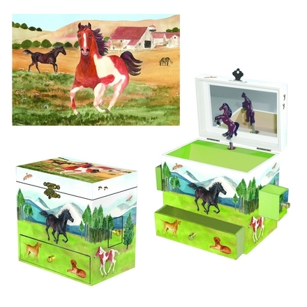 The tallest style is excellent for tiny treasures. Earrings, bracelets, charms and sachets are all safe and comfortable inside. Four drawers, one in front and one on each side. Plays “Home on the Range.”