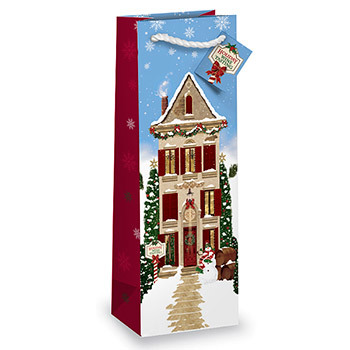 This festive bottle gift bag depicts a holiday decorated house frontal. It features a gift tag that is threaded onto the soft rope handle. Includes a plastic hanging tab.