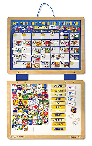 Keep life organized with this wooden magnetic perpetual calendar. Open the fabric hinged boards to reveal a calendar grid on one board, while the other board keeps all the magnets close at hand. A sturdy cord is attached for hanging. These dry-erase boards include 134 magnets including years, months, days and most holidays and childhood activities.