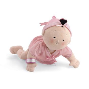 | Super soft velour, embroidered facial features, ID bracelet for personalization and removable cotton jersey knit wrap top. Soft fleece diaper with velcro closures for added play value. Adorable outie belly bottom and lifelike bottom enhances baby doll charm. Suitable for embroidered personalization. A wonderful gift idea to help an older sibling welcome a new baby home! TTT – Toy Tips Tested and Trusted, Creative Child Magazine Seal of Excellence awards. |