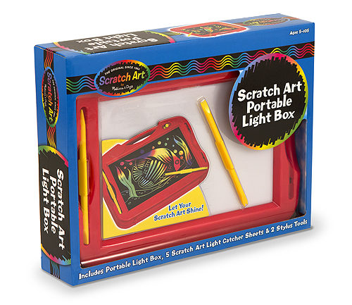 Place a Light Catcher sheet on the design surface, flip the switch, and bring your designs to life! This sturdy take-along design desk makes your “stained glass” masterpieces glow, even on gloomy days. A backlit pane shines through Scratch Art Light Catcher sheets as you etch! Just use the included stylus tools to see amazing stained-glass effects light up. The kids arts-and-crafts set comes with four Light Catcher Scratch Art sheets, two design tools, and the illuminating design desk light box toy. Refill with any standard size (8.5 x 5.5 in) Scratch Art Light Catcher sheets.