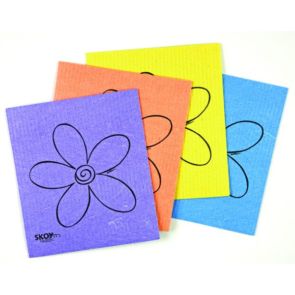 4 Skoy cloths in a variety pack of colors with flower print (4 colors randomly selected from orange, yellow, green, blue, pink, purple, apple green, soft yellow). Each Skoy cloth is approximately 7″x7″.