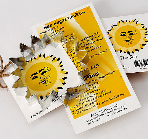 Model# 01-159 Tin cookie cutter with sturdy tin handle and colorful recipe card. Each card includes a recipe for cookies and frosting. Size 5” W