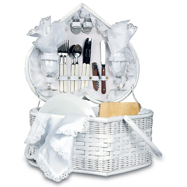 Description: The exquisitely handcrafted Wedding Heart picnic basket was designed for the most romantic couples. Heart-shaped, white washed rattan and bamboo construction makes this basket stand out amongst the rest. The Wedding Heart is fully-lined with white quilted cotton and includes all the amenities needed for an intimate picnic for two. Ideal for weddings, anniversaries, and Valentine’s Day!Components:2 plates (melamine/9 inch) 2 handblown wine glasses (8 oz.) 1 hardwood cutting board (6×6 inch) 2 (18/0) stainless steel forks/knives/spoons 2 napkins (100% cotton/14×14 inch/with eyelet at edges) 1 stainless steel waiter-style corkscrew with wooden handle 1 set of salt and pepper shakers 1 food storage container (plastic) 1 stainless steel cheese knife with wooded handle 1 tablecloth (100% cotton with eyelet edging/44×44 inch)